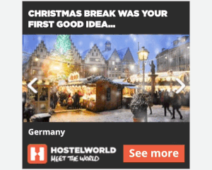 Programmatic display banners promoting seasonal market moments, specifically, Christmas Markets in Germany. The campaign features a variety of creative formats, each opening with an eye-catching snow animation overlaid on a destination image, before transitioning to a second frame showcasing hostel offerings. Formats include expandable carousel rich media, 3D cube carousel, and standard display.