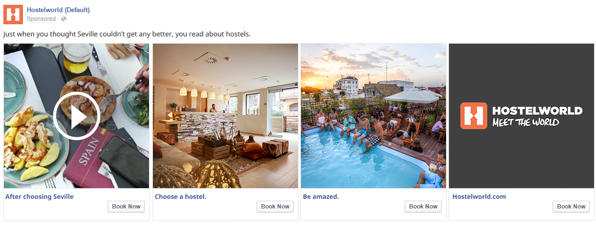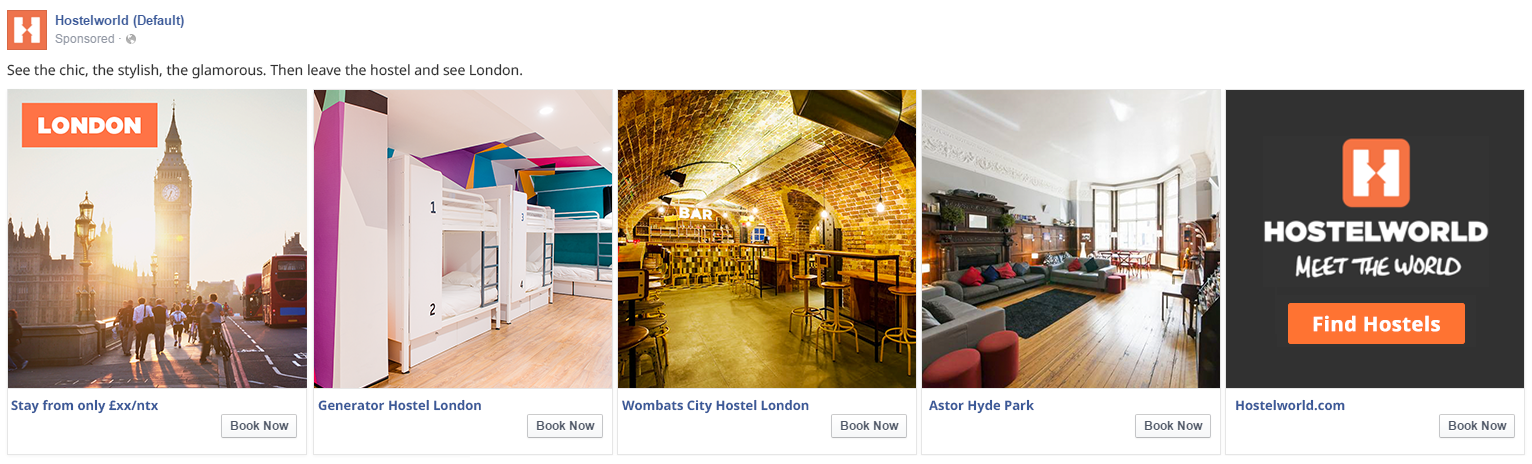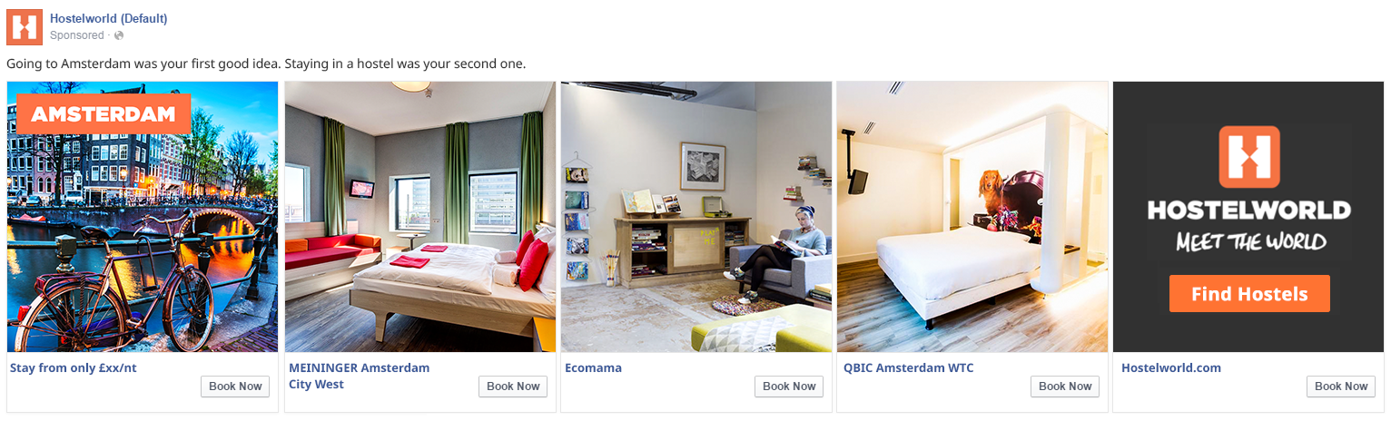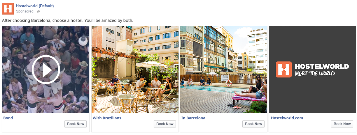 Campaign promoting top traveller destinations and their standout hostels. Display creatives open on the first frame with an instantly recognisable landmark, before transitioning to a striking image of a featured hostel. The final display banner showcases the top 3 hostels in Barcelona in a sliding carousel animation. The campaign extends into an integrated approach on Facebook Carousel, mirroring the same destination-first creative strategy.